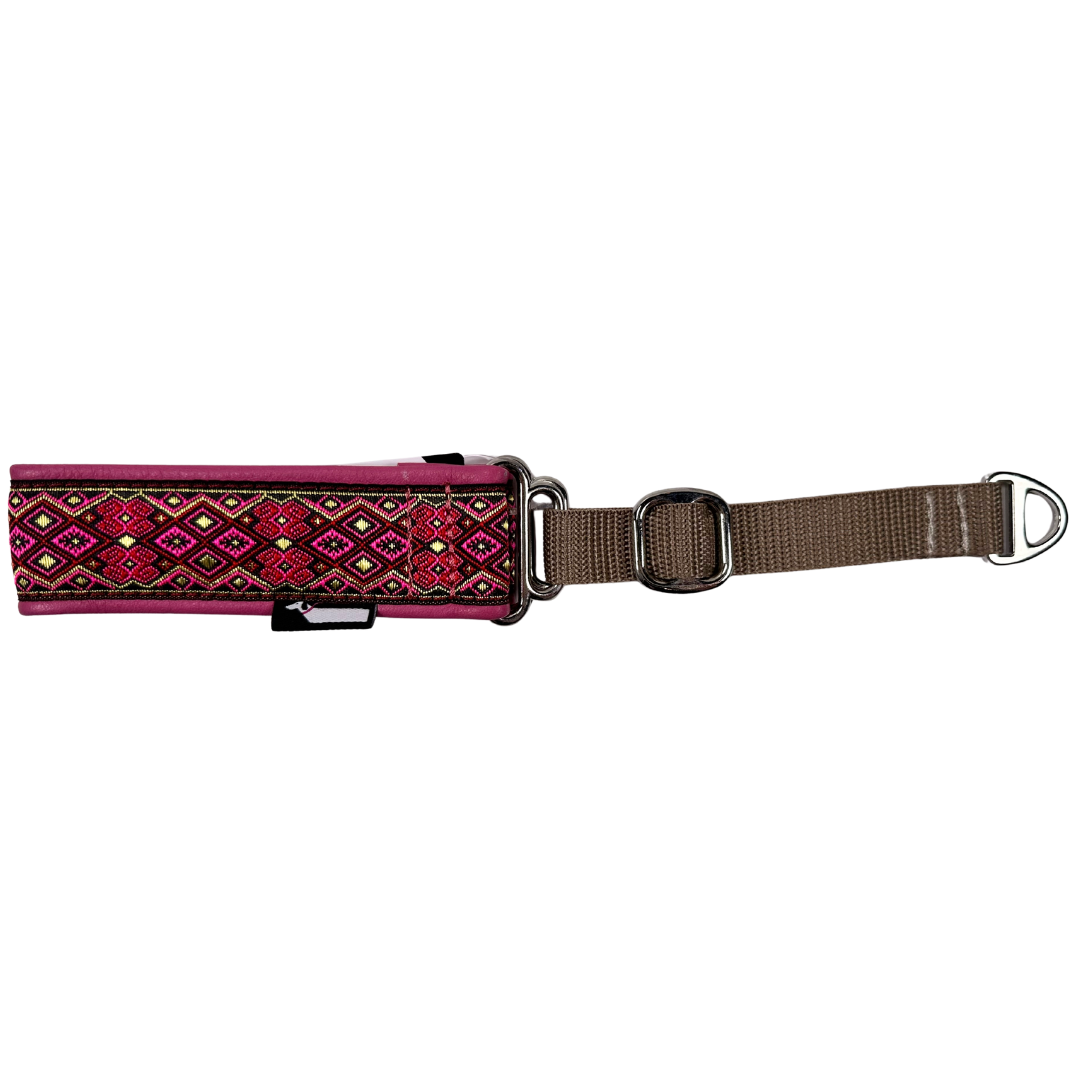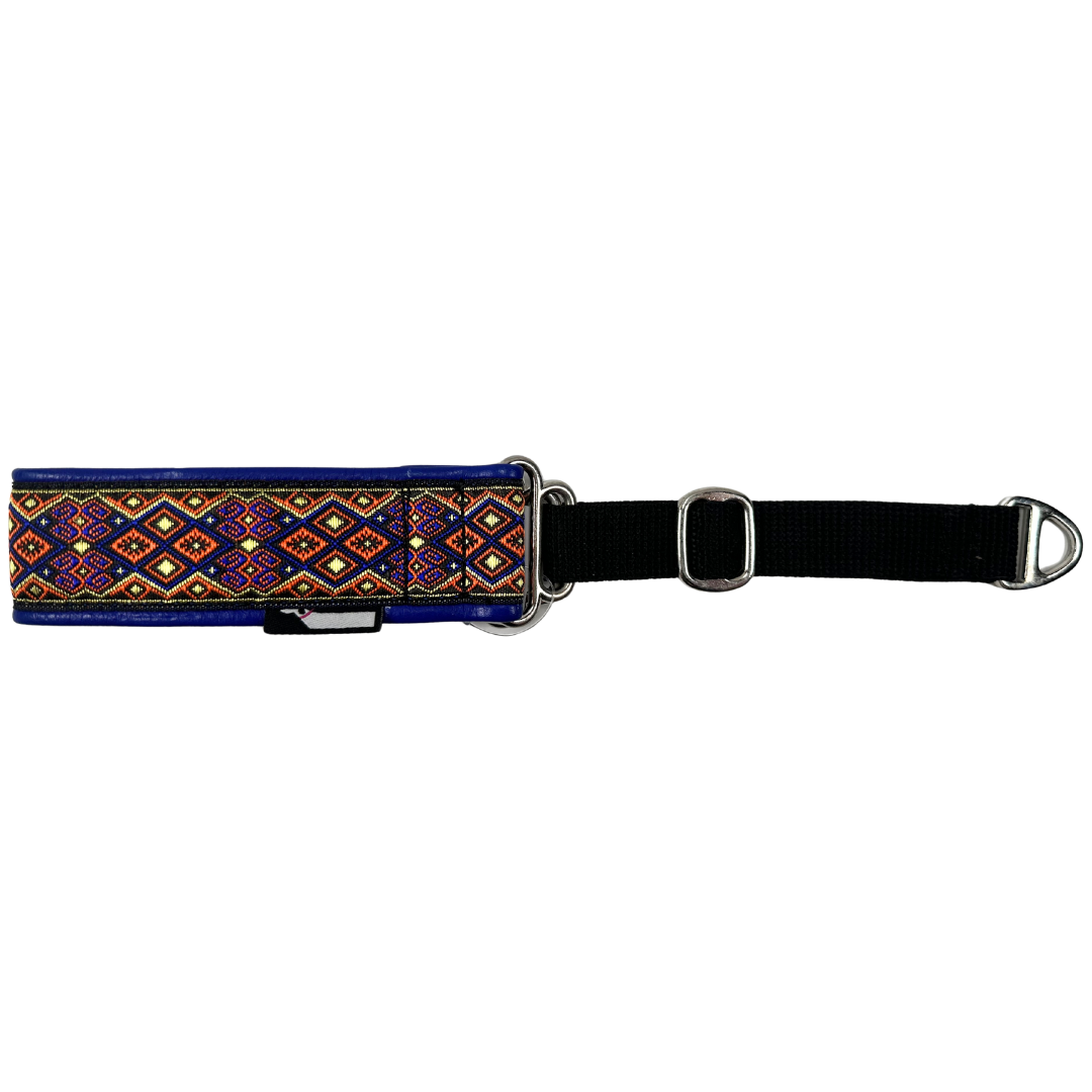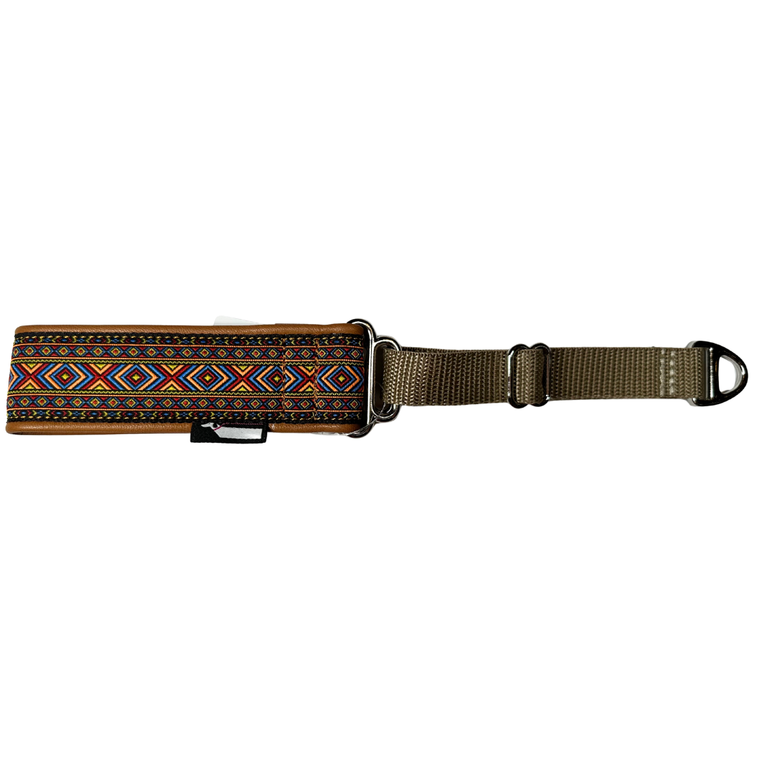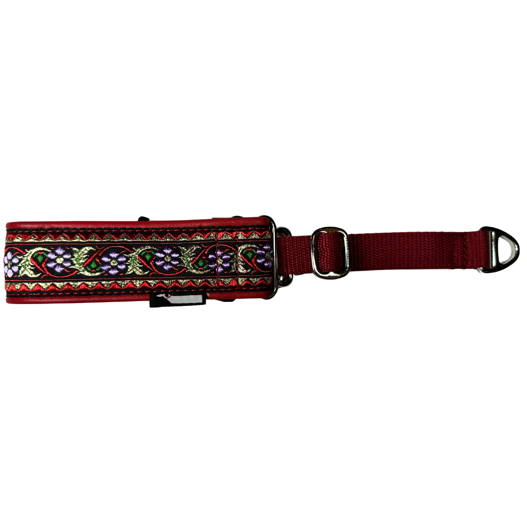 Ól úr mjúku leðri, skreytt með litríkum textíl borða. Leðrið rennur vel á feldi hundsins og því eru ólarnar sérstaklega hentugar fyrir feldhunda til að lágmarka að flækjur myndast á ólarsvæðinu.