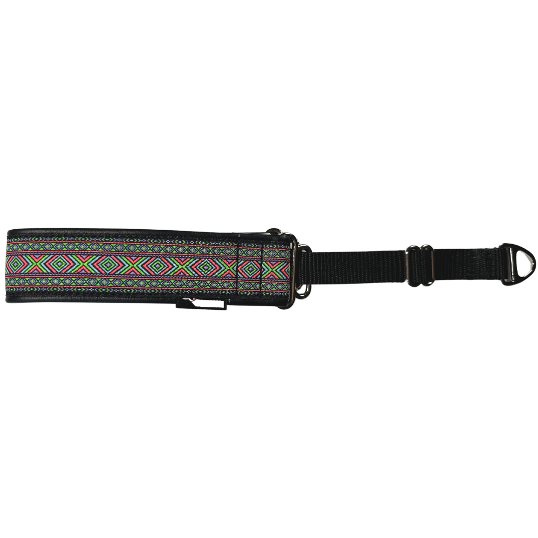 Ól úr mjúku leðri, skreytt með litríkum textíl borða. Leðrið rennur vel á feldi hundsins og því eru ólarnar sérstaklega hentugar fyrir feldhunda til að lágmarka að flækjur myndast á ólarsvæðinu.
