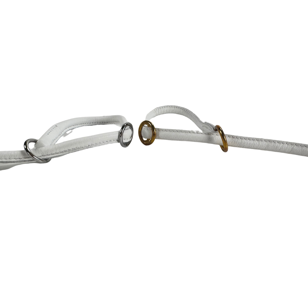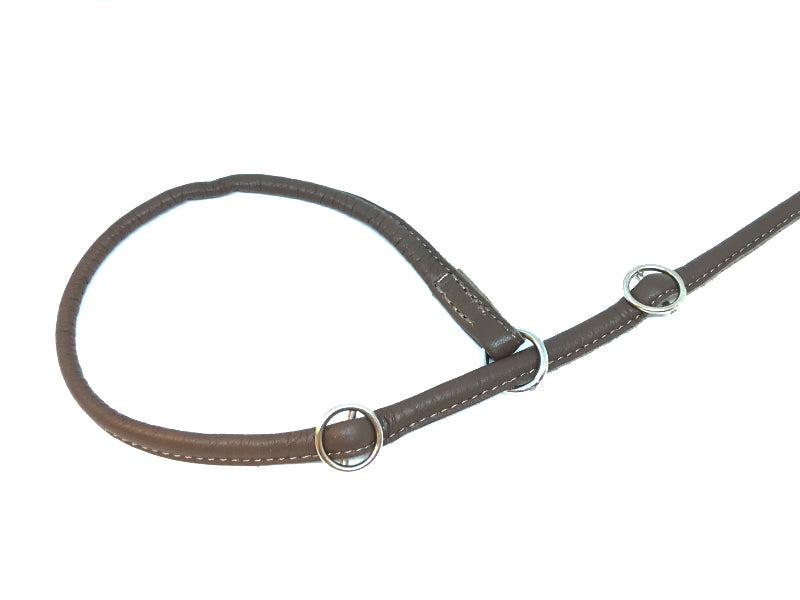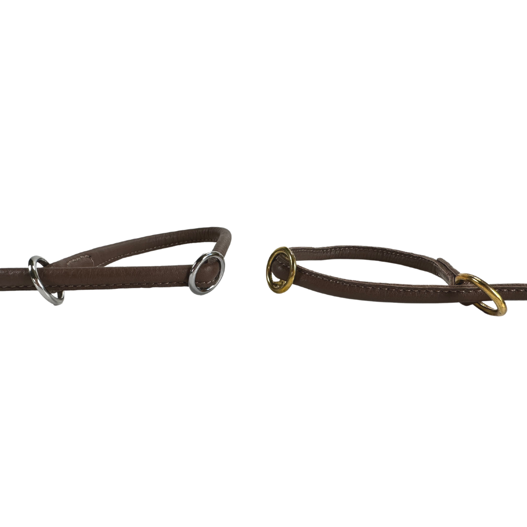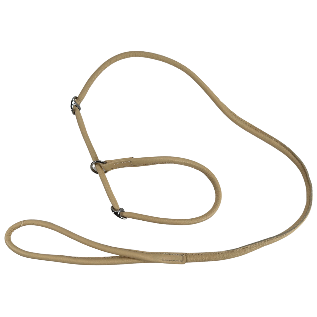 Sýningartaumur úr leðri, styrktur með nælonþræði að innan. Taumurinn er með stoppara á tveim stöðum, annan sem kemur í veg fyrir að það þrengi að hálsi hundsins og hinn til að fyrirbyggja að taumurinn opnist of mikið.