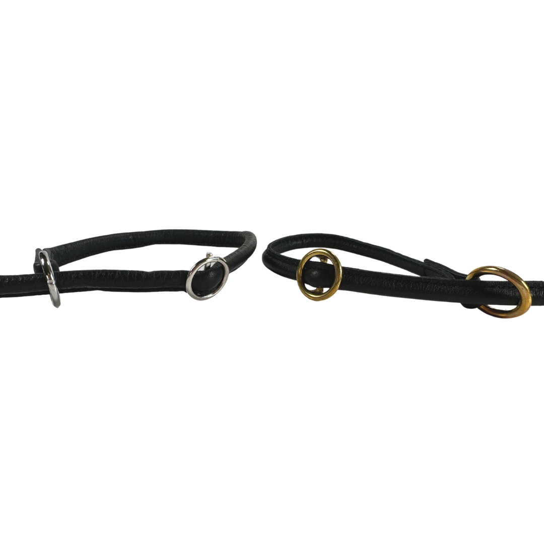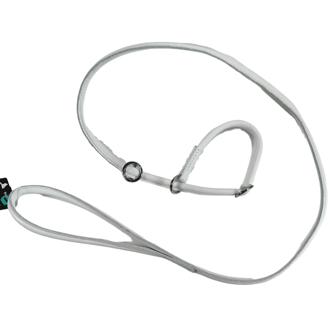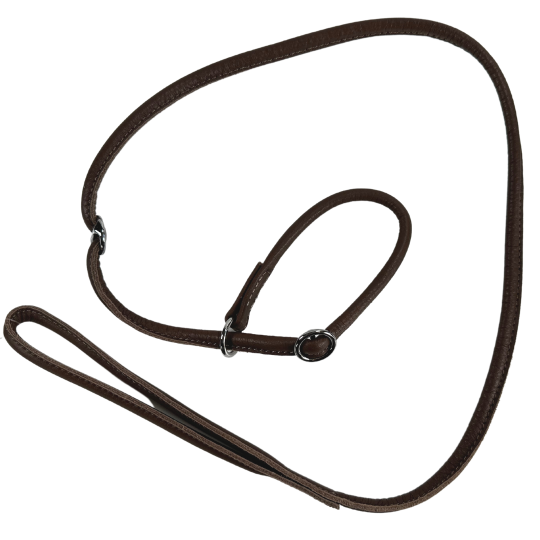 Sýningartaumur úr leðri, styrktur með nælonþræði að innan. Taumurinn er með stoppara á tveim stöðum, annan sem kemur í veg fyrir að það þrengi að hálsi hundsins og hinn til að fyrirbyggja að taumurinn opnist of mikið.