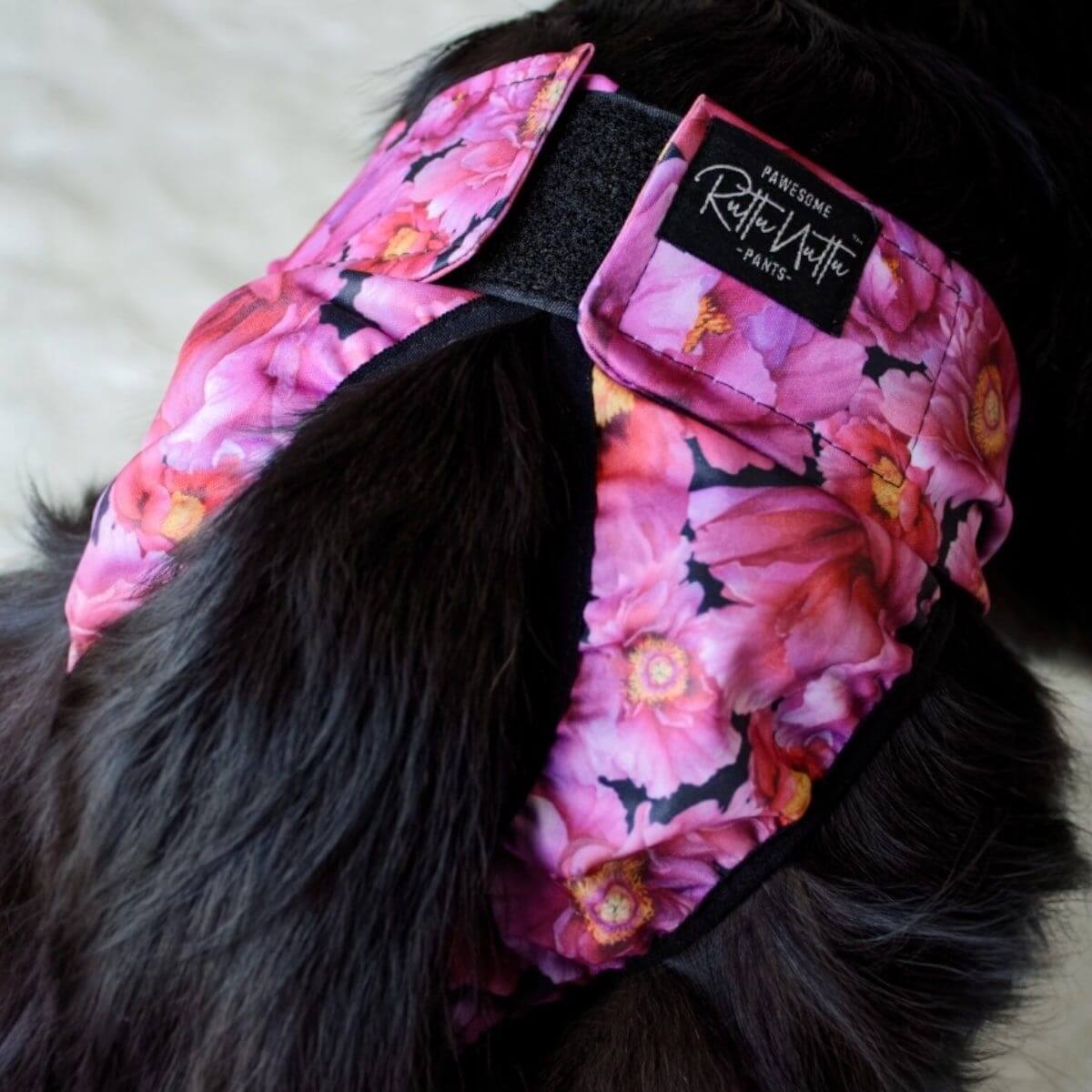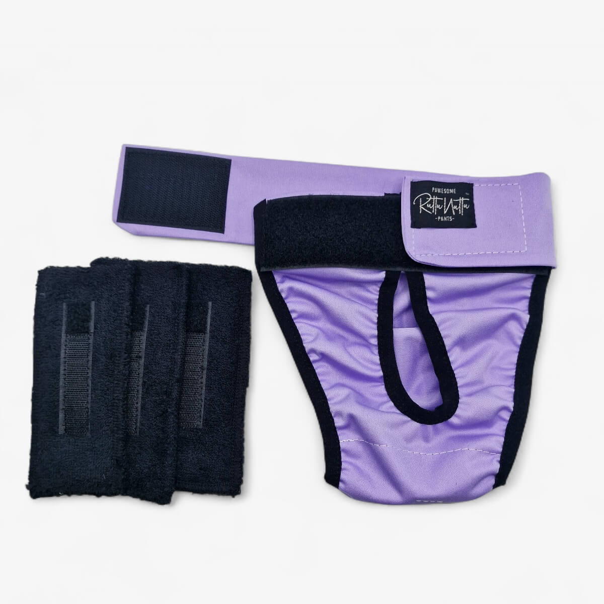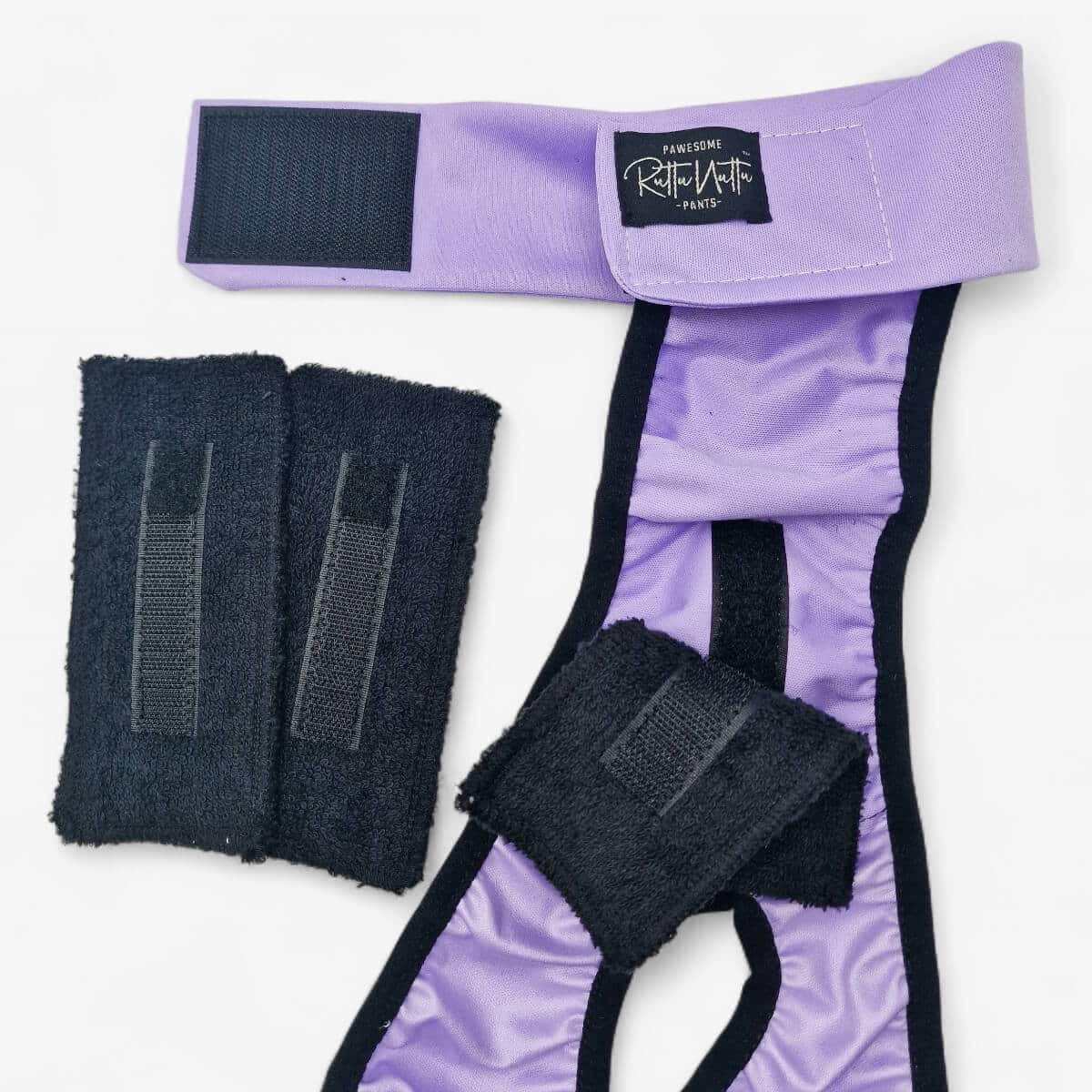 Lóðabuxur úr mjúku og teygjanlegu efni. Einfalt er að klæða tík í buxurnar þar sem þær opnast alveg og eru festar saman með frönskum rennilás. Buxurnar sitja vel og örugglega á sínum stað.