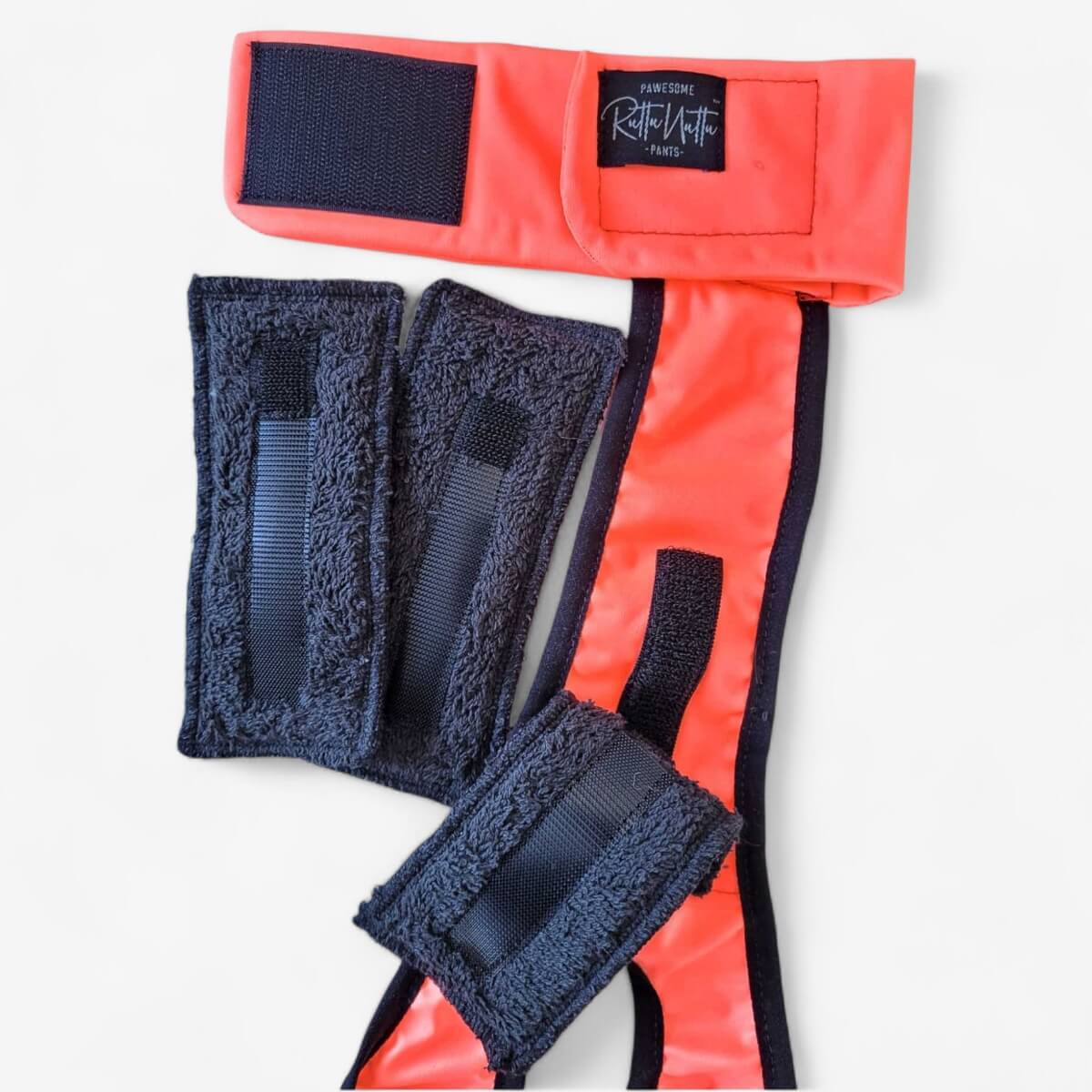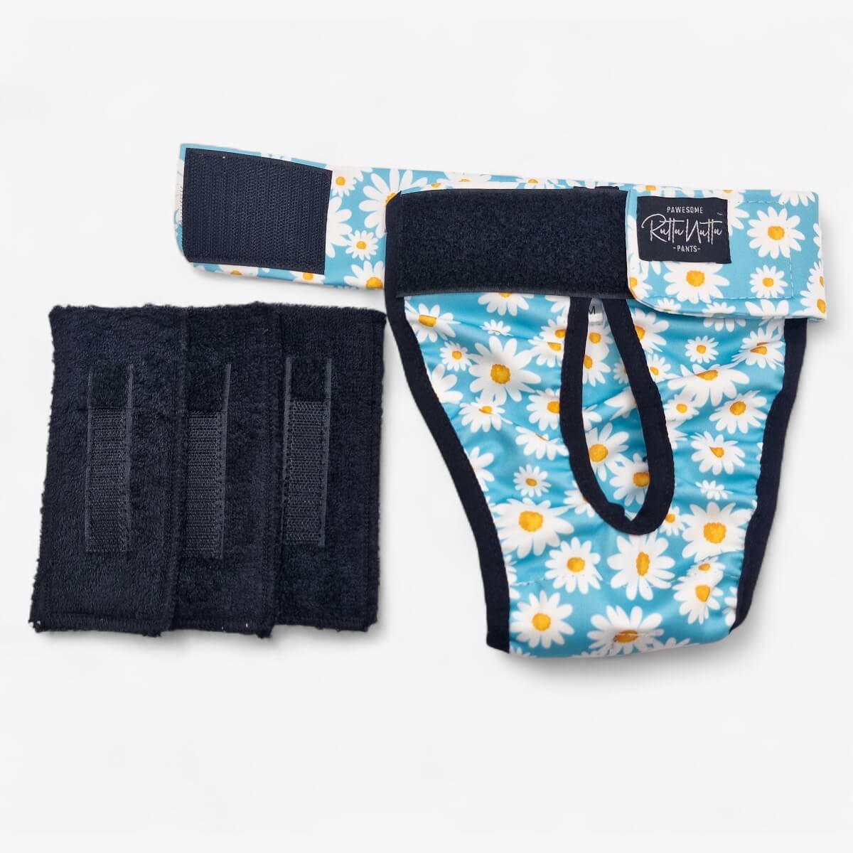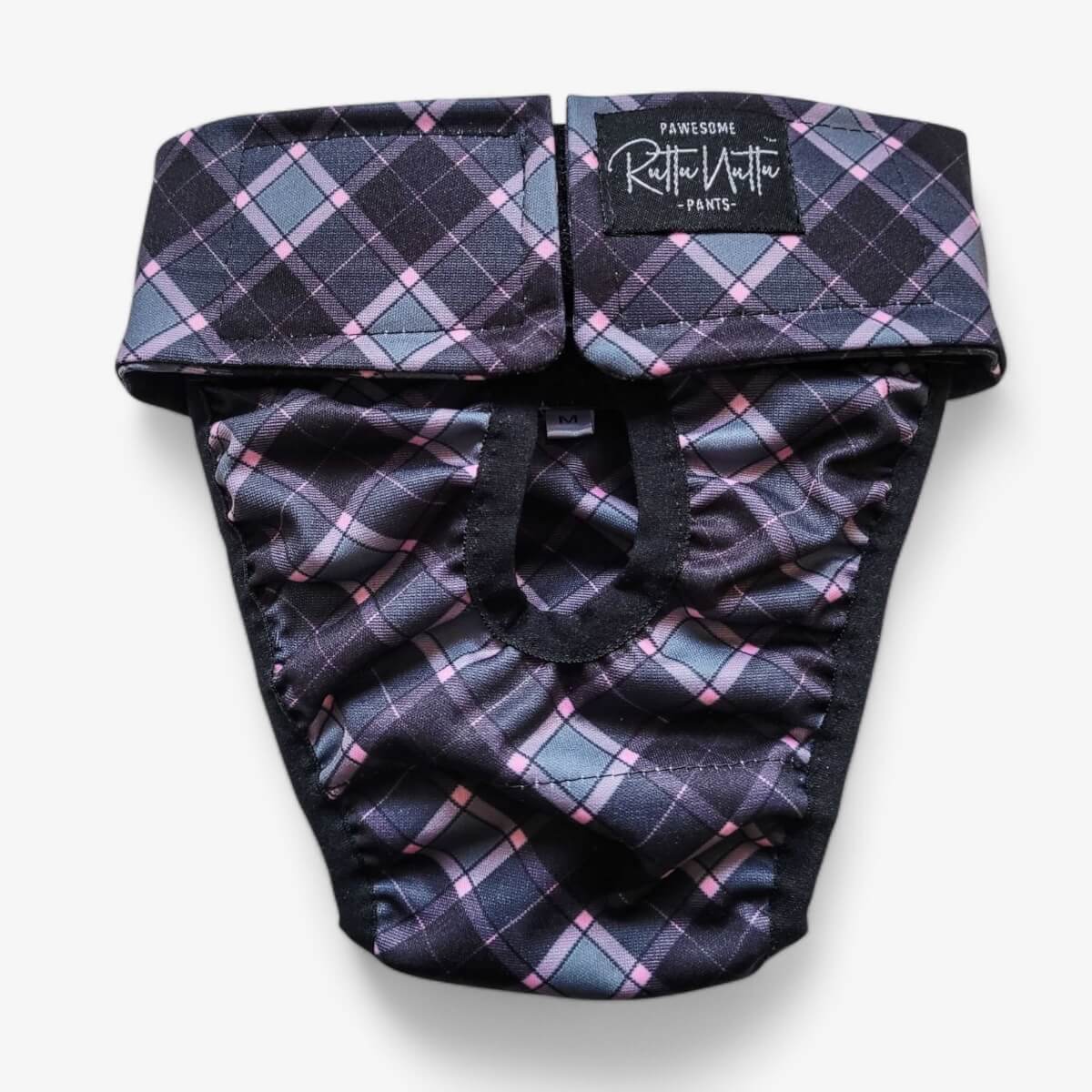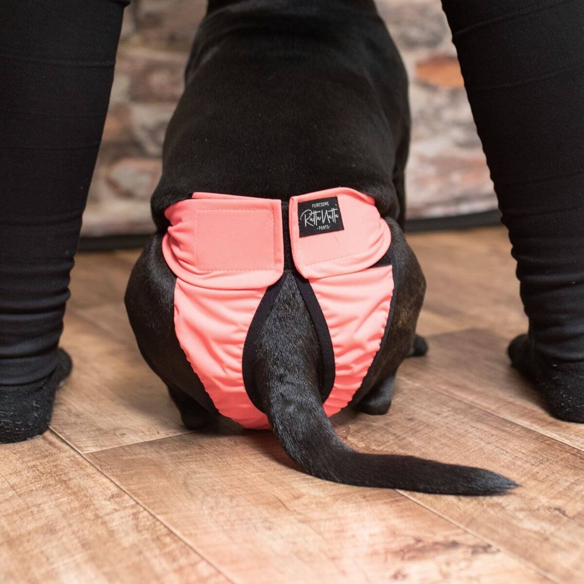 Lóðabuxur úr mjúku og teygjanlegu efni. Einfalt er að klæða tík í buxurnar þar sem þær opnast alveg og eru festar saman með frönskum rennilás. Buxurnar sitja vel og örugglega á sínum stað.